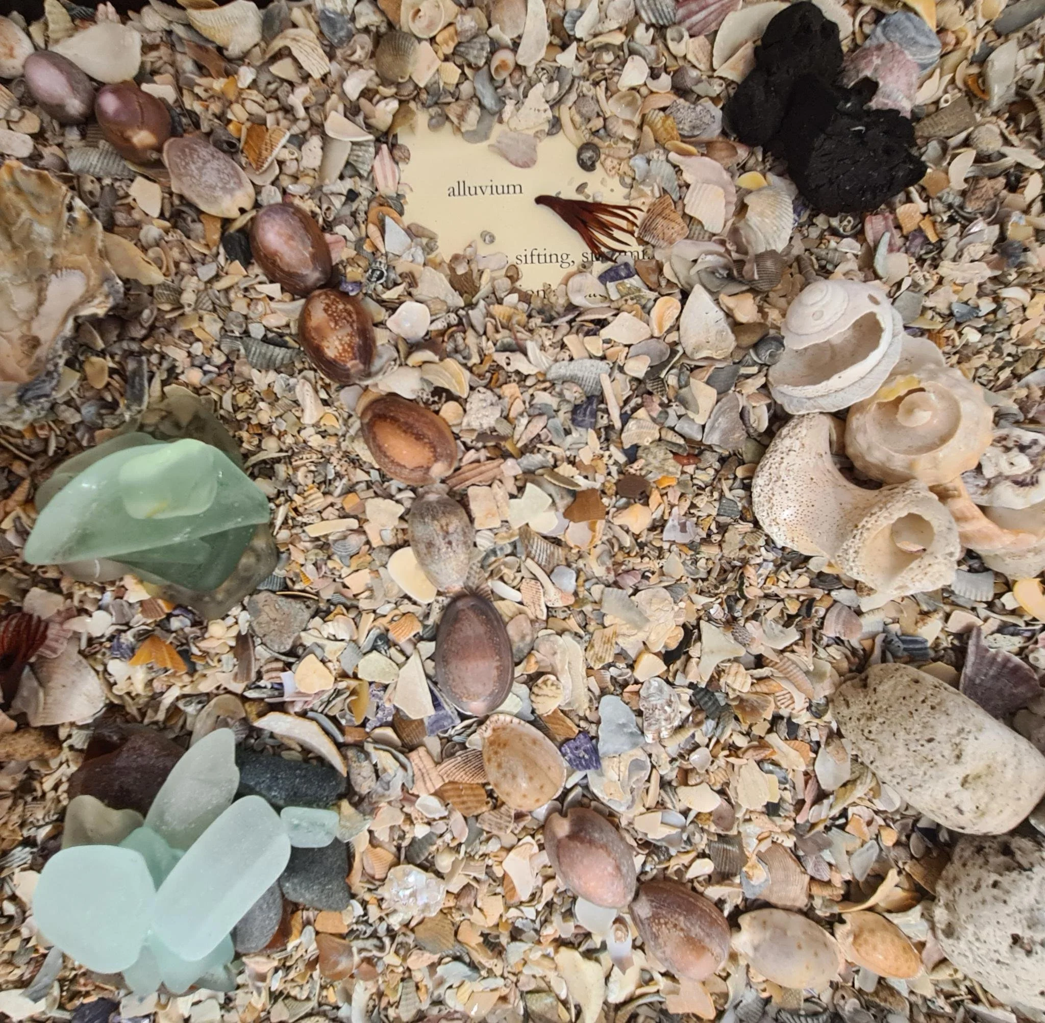 Timber trays, seaglass, sand stones, seaweed